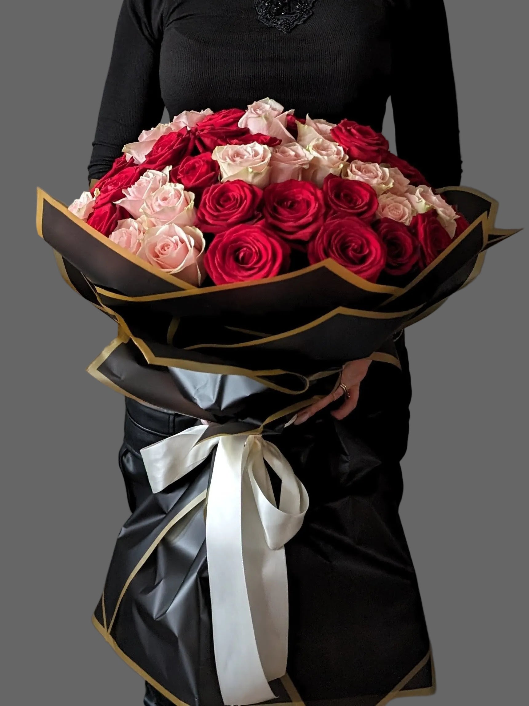 Celebrate love this Valentine’s Day with our Rose Duet Bouquet, featuring 30 passionate red roses paired with 20 soft blush pink roses. The deep red blooms symbolize devotion and passion, while the gentle blush pink roses add a tender, romantic contrast—together creating a beautifully harmonious arrangement.